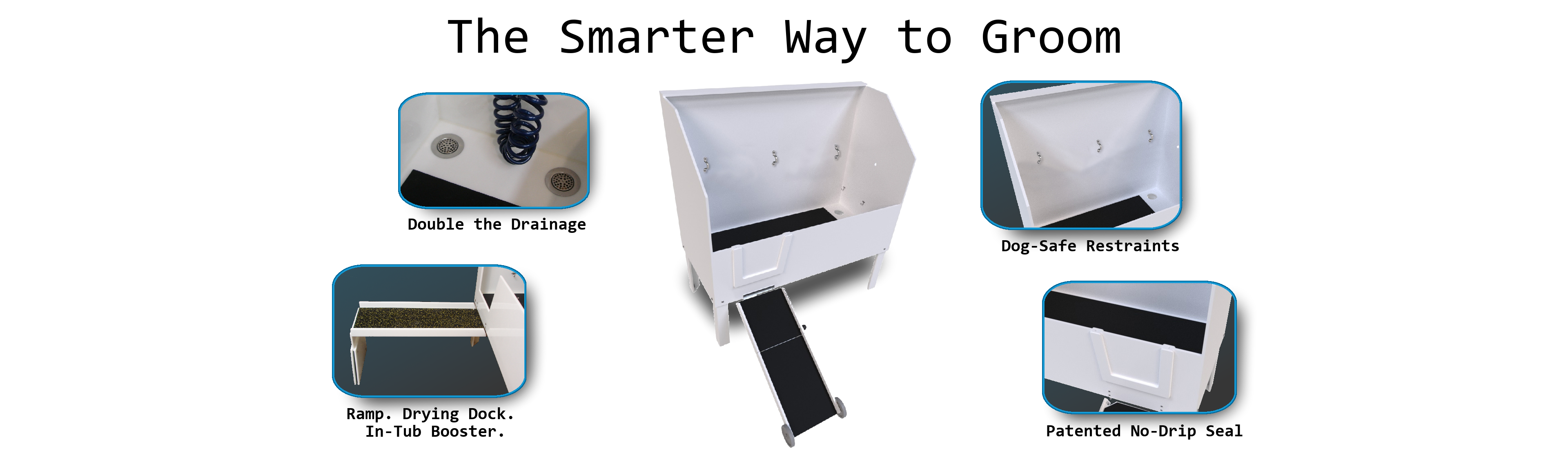 All Poly Pet Tubs include, 2 restraint bars with numerous positions for restraints, 2 quick adjust restraints, thick 1/2″ durable rubber mat for floor of tub and dual-drains for easy and efficient drainage.